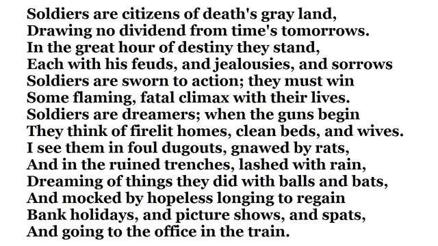 A touching poem with its simple dream that things might be as they were before with the realisation that there is no hope that they ever will be the same again. Seigfried Sassoon was a hero of WW1 and a friend to Wilfred Owen. He was awarded the Military Cross. After the war he became famous as an antiwar activist. The picture is "Flanders" by Otto Dix, born in 1891, a German who was nearly killed many times while fighting for Germany in World War I. He fought at the Battle of the Somme and on the Eastern Front. Soldiers are citizens of death's gray land, Drawing no dividend from time's tomorrows. In the great hour of destiny they stand, Each with his feuds, and jealousies, and sorrows Soldiers are sworn to action; they must... Смотреть видео...